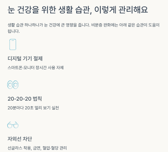 - 선글라스로 자외선 차단, 금연, 혈압·혈당 관리