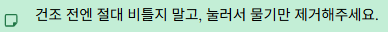 건조 전엔 절대 비틀지 말고, 눌러서 물기만 제거해 주세요.
