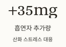 흡연자는 산화 스트레스가 높기 때문에 약 135mg~140mg 이상을 필요로 한다고 해요.