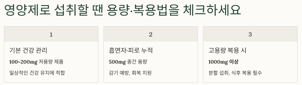 - 흡연자, 피로 누적, 감기 예방: 500mg까지는 비교적 안전