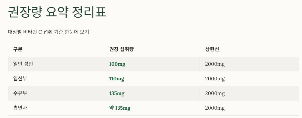 | 흡연자 | 기본 권장량 + 35mg 추가 권장 |