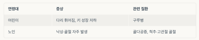 어린이는 뼈가 휘는 구루병이나 성장 지연이 대표적이며, 노인의 경우 뼈가 약해져 낙상과 골절 사고가 자주 발생할 수 있습니다.