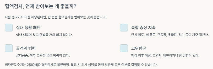 비타민D 수치는 25(OH) D 혈액검사로 확인하며, 필요시 의사 상담을 통해 보충제 복용 여부를 결정할 수 있습니다.