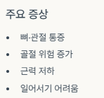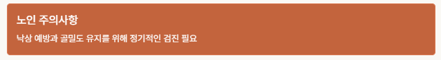| 노인 | 낙상·골절 자주 발생 | 골다공증, 척추·고관절 골절 |