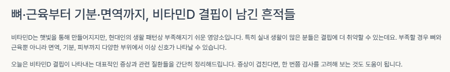 비타민D는 햇빛을 통해 만들어지지만, 현대인의 생활 패턴상 부족해지기 쉬운 영양소입니다. 특히 실내 생활이 많은 분들은 결핍에 더 취약할 수 있는데요. 부족할 경우 뼈와 근육뿐 아니라 면역, 기분, 피부까지 다양한 부위에서 이상 신호가 나타날 수 있습니다. 오늘은 비타민D 결핍이 나타내는 대표적인 증상과 관련 질환들을 간단히 정리해 드립니다. 증상이 겹친다면, 한 번쯤 검사를 고려해 보는 것도 도움이 됩니다.