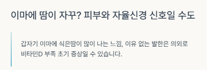 갑자기 이마에 식은땀이 많이 나는 느낌, 이유 없는 발한은 의외로 비타민D 부족 초기 증상일 수 있습니다.