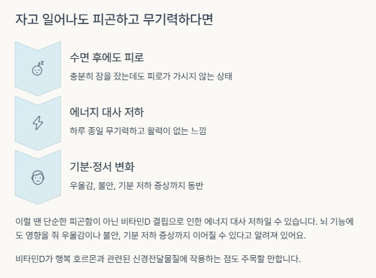 이럴 땐 단순한 피곤함이 아닌 비타민D 결핍으로 인한 에너지 대사 저하일 수 있습니다. 뇌 기능에도 영향을 줘 우울감이나 불안, 기분 저하 증상까지 이어질 수 있다고 알려져 있어요.
