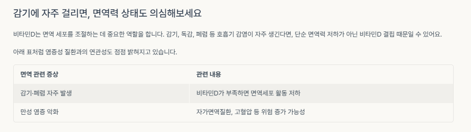 | 감기·폐렴 자주 발생 | 비타민D가 부족하면 면역세포 활동 저하 |