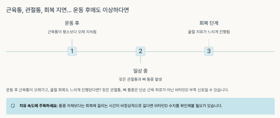 잦은 관절통, 뼈 통증은 단순 근육 피로가 아닌 비타민D 부족 신호일 수 있습니다. 통증 자체보다는 ‘치유 속도’에 주목해 보세요.