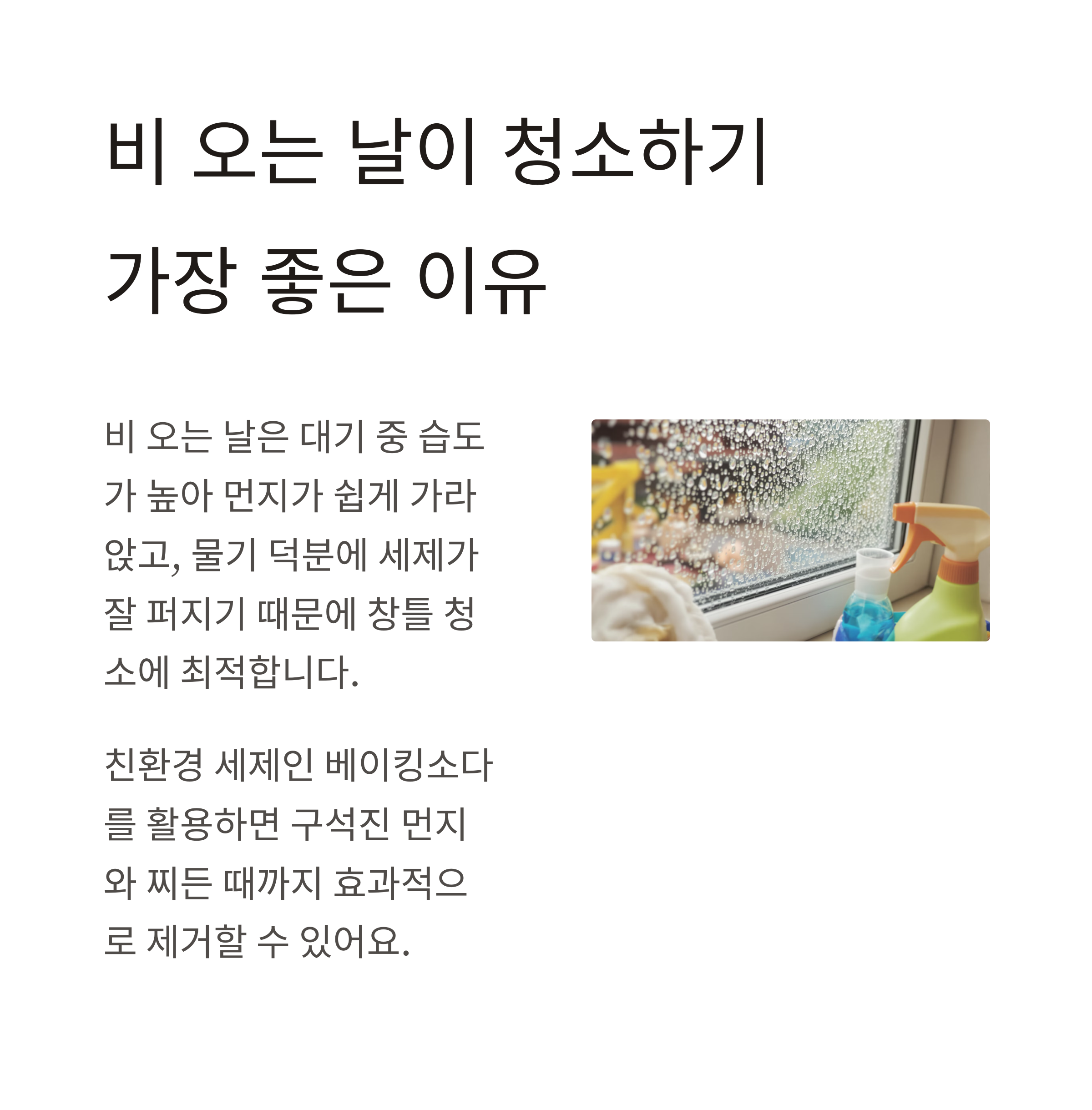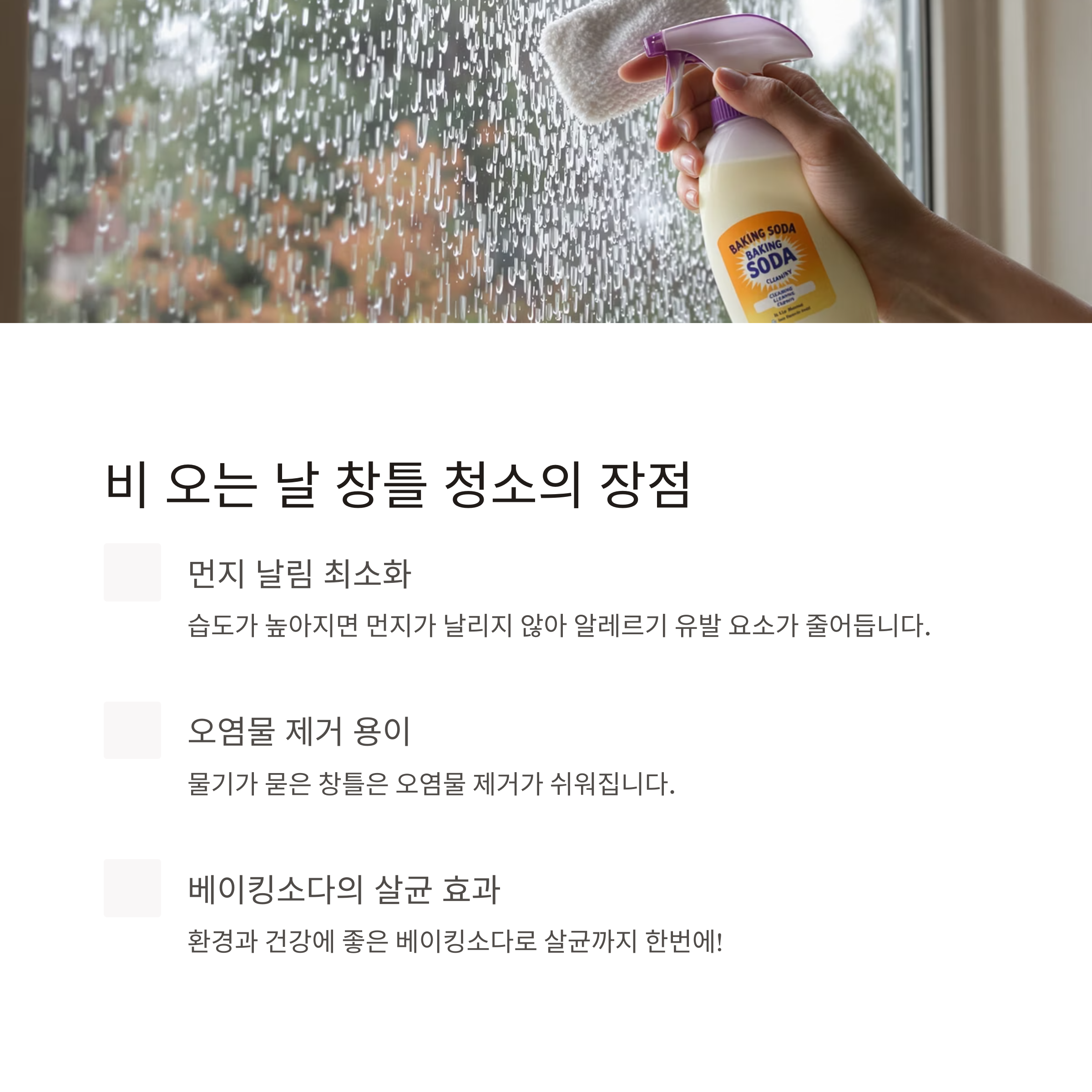 비 오는 날은 대기 중 습도가 높아 먼지가 쉽게 가라앉고 물기 덕분에 세제가 잘 퍼지기 때문에 창틀 청소에 최적입니다. 여기에 친환경 세제인 베이킹소다를 더하면 구석진 먼지와 찌든 때까지 효과적으로 제거할 수 있습니다. 오늘은 비 오는 날에 창틀과 방충망을 효율적으로 청소하는 방법과 베이킹소다의 활용법을 단계별로 정리해 드립니다.