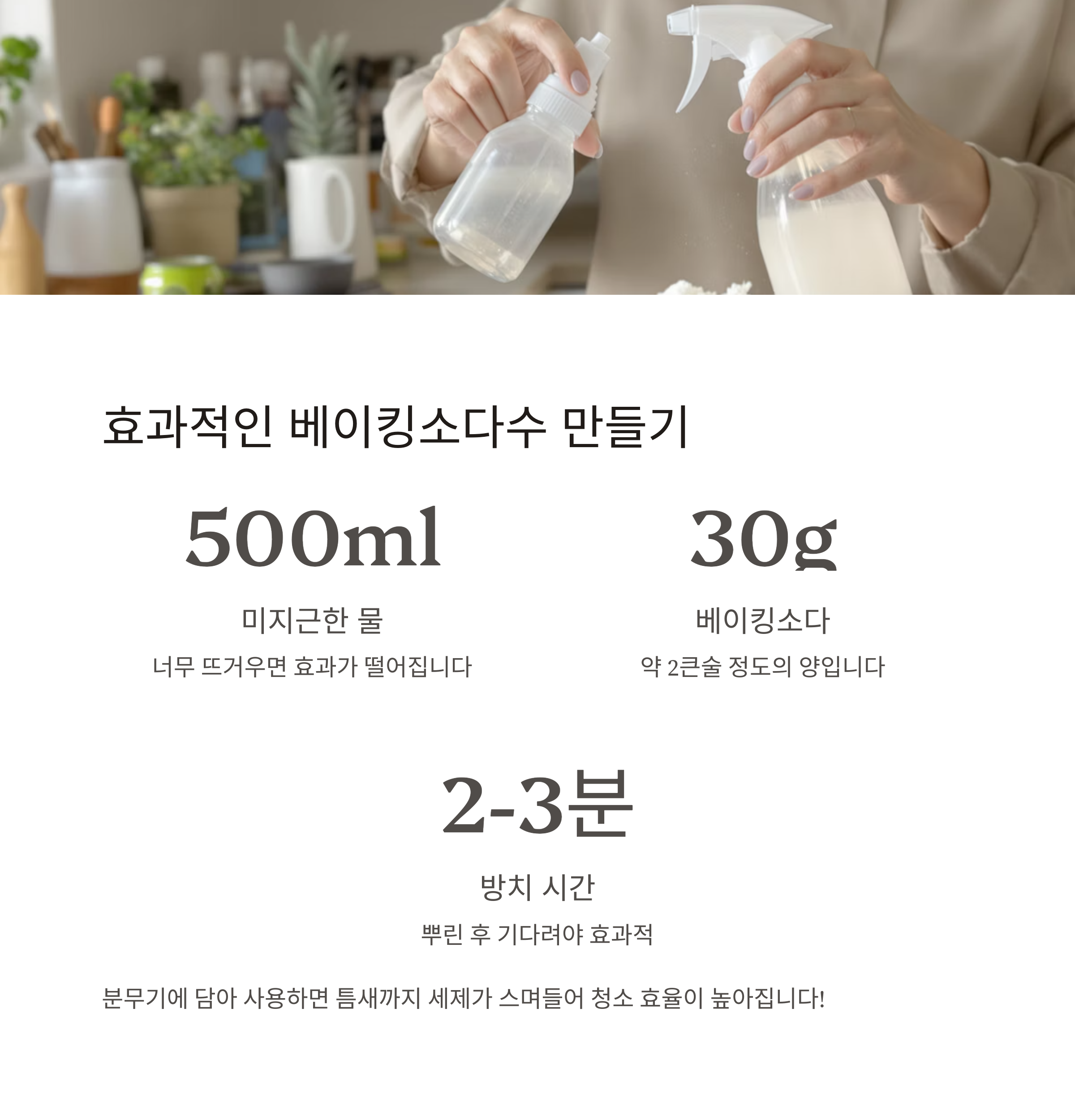 청소 효율이 훨씬 높아집니다. 이때 뿌린 후 2~3분 정도 방치하면 더 좋습니다.