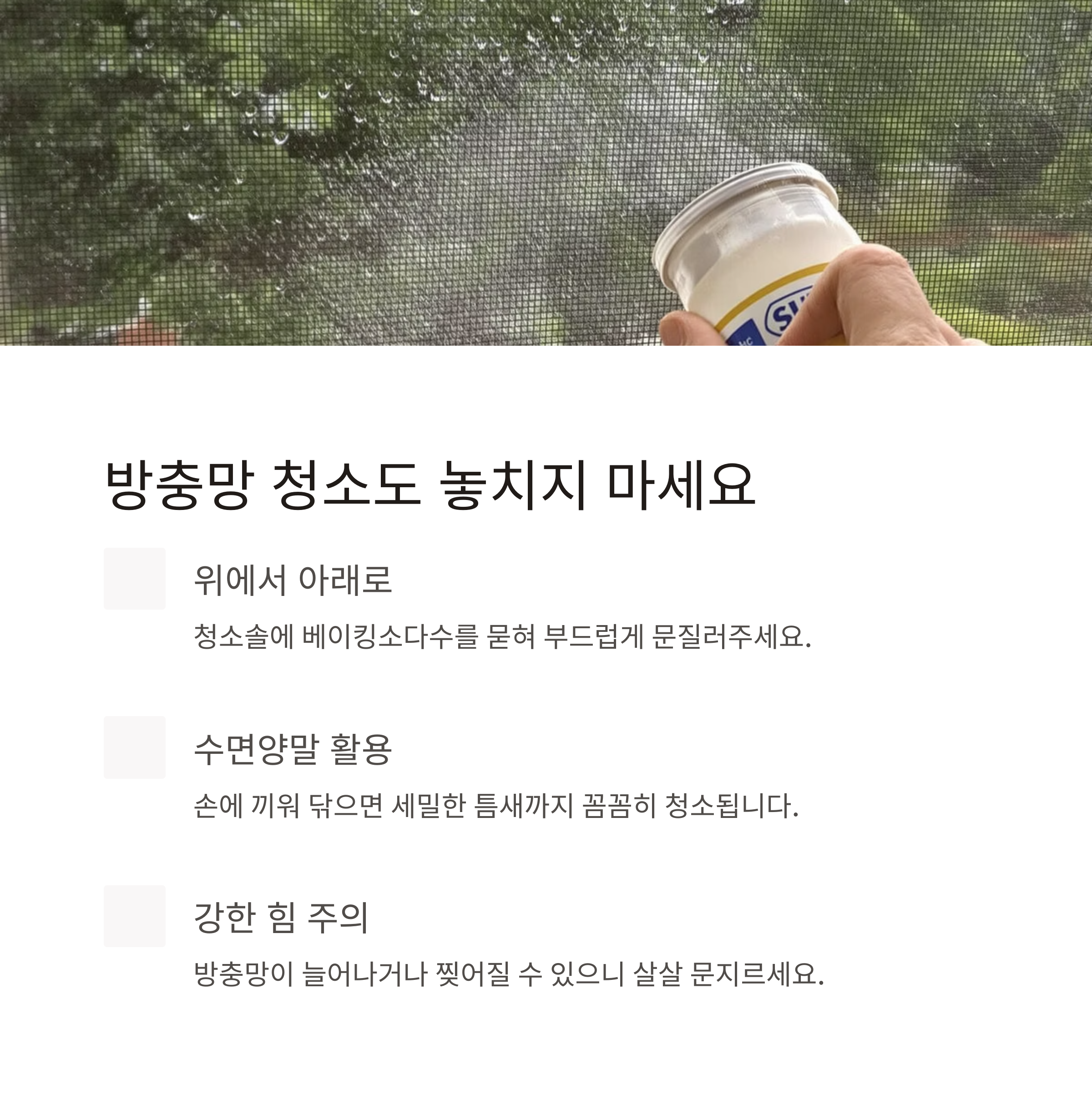 | 방충망 청소 | 3분 | 힘주지 말고 부드럽게 문지르기 |