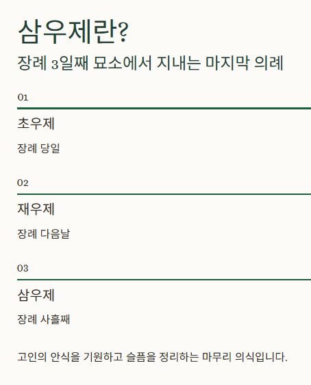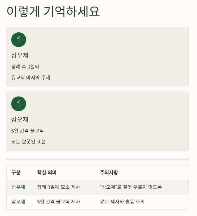 | 삼우제 | 장례 3일째, 묘소 제사 | “삼오제”로 잘못 부르지 않도록 주의 |
