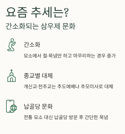 또한 도시화와 납골당 문화의 확산으로 전통 묘소 성묘 대신 납골당 방문 후 간단한 묵념으로 대체하는 가정도 늘고 있습니다.