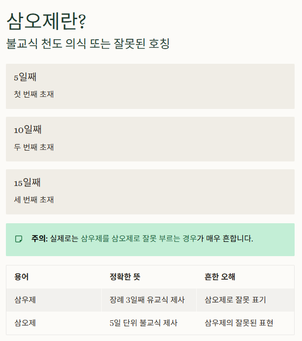| 삼오제 | 5일 간격 불교식 제사 | 유교 제사와 혼동하지 않도록 구분 필요 |