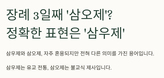 | 삼우제 | 장례 3일째 지내는 유교식 마지막 우제 | 삼오제로 잘못 표기되거나 혼용되는 경우 많음 |