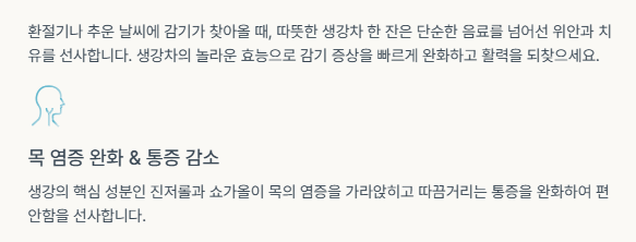 목이 간질간질하거나 기침이 날 때, 따뜻한 생강차 한 잔은 꽤나 위로가 되죠. 생강 속 진저롤과 쇼가올이 강력한 항염 작용을 하면서 목의 염증을 진정시키고 가래 배출을 도와줍니다. 이와 함께 라피노스라는 성분은 호흡기 점막을 보호해 주는 데 도움을 줘, 감기 예방과 회복에 유용하다고 알려져 있습니다.