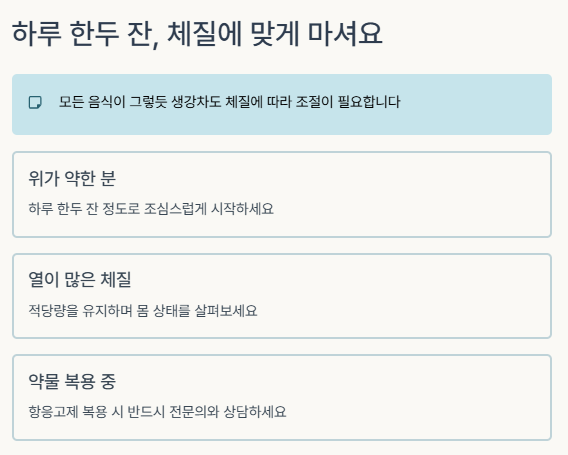 모든 음식이 그렇듯 생강차도 체질에 따라 조절이 필요합니다. 위가 약하거나 속이 더부룩한 사람, 열이 많은 체질인 분들은 하루 한두 잔 정도로 조심스럽게 시작해보세요. 항응고제를 복용 중인 분들도 반드시 전문의와 상담 후 섭취하는 것이 안전합니다.