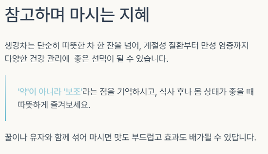 생강차는 단순히 따뜻한 차 한 잔을 넘어, 계절성 질환부터 만성 염증까지 다양한 건강 관리에 좋은 선택이 될 수 있습니다. 다만 ‘약’이 아니라 ‘보조’라는 점을 기억하시고, 식사 후나 몸 상태가 좋을 때 따뜻하게 즐겨보세요. 꿀이나 유자와 함께 섞어 마시면 맛도 부드럽고 효과도 배가될 수 있답니다.