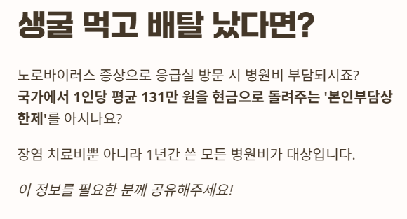⚠️ 혹시 생굴 먹고 배탈(장염)로 고생 중이신가요? 노로바이러스 증상으로 응급실에 가거나 입원하게 되면 병원비가 꽤 부담되는데요. 국가에서 1인당 평균 131만 원을 현금으로 돌려주는 '본인부담상한제'를 알고 계신가요?