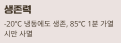| 생존력 | -20℃ 냉동에도 생존, 85℃ 이상 1분 가열 시만 사멸 |