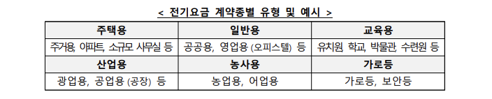 아래표는 전기요금 계약종별 유형 및 예시표입니다.