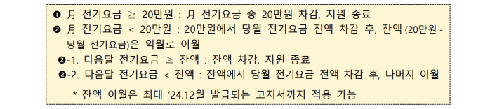 사업자 1개 사업장만 전기요금 지원하며 대상자 통보후 2024년 전기요금 고지서에 청구되는 전기요금부터 최대 20만 원까지 지원되고 그 이상 전기요금은 지원하지 않습니다. 아래표 예시를 참고하시면 되겠습니다.