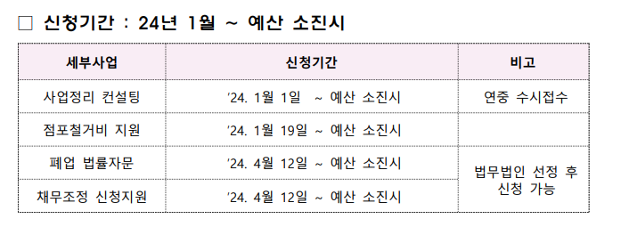 소상공인 폐업 점포철거비 지원금 2024년 1월~예산소진 시까지입니다. 아래표를 참조해 주세요.