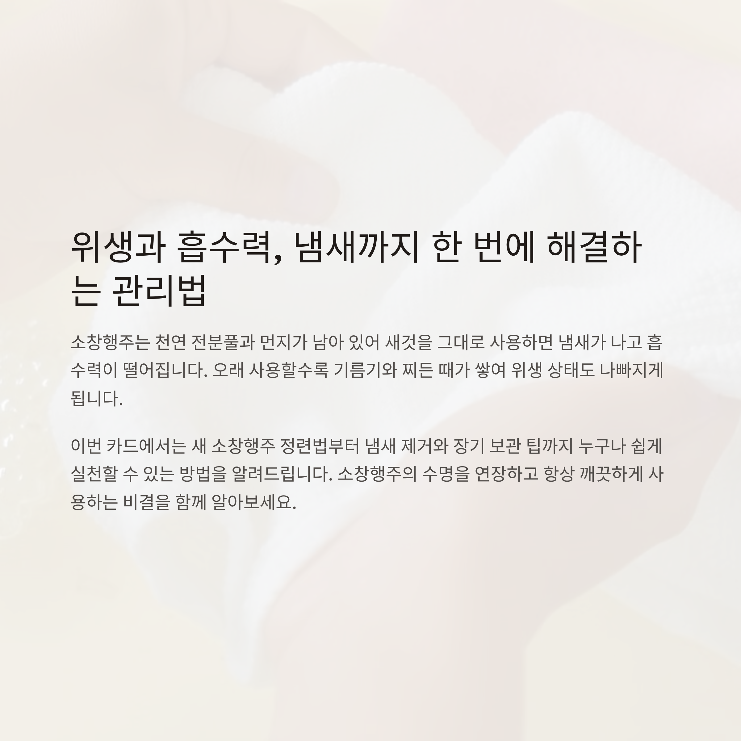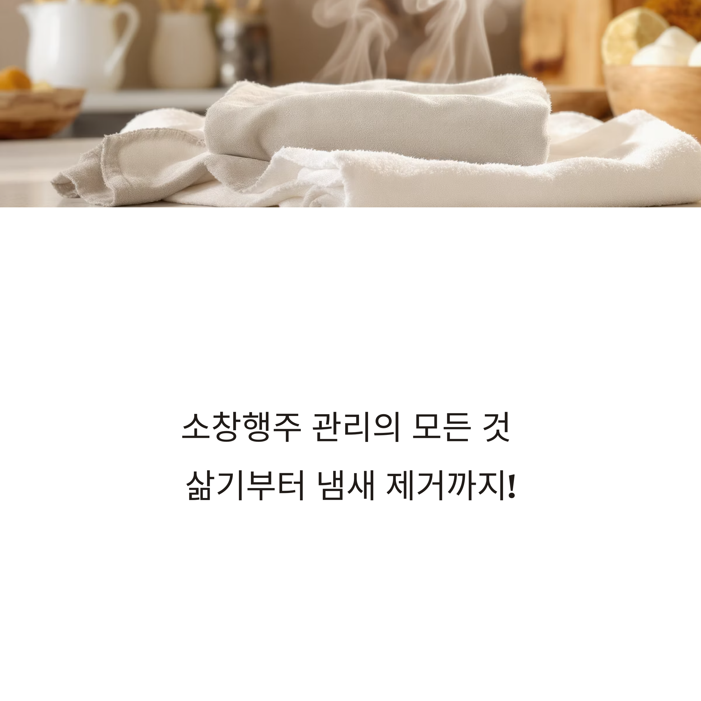 소창행주는 올바른 관리만 해도 6개월 이상 위생적으로 쓸 수 있습니다. 베이킹소다, 과탄산소다와 햇볕 건조를 활용해 주방을 항상 깨끗하게 지켜보세요.