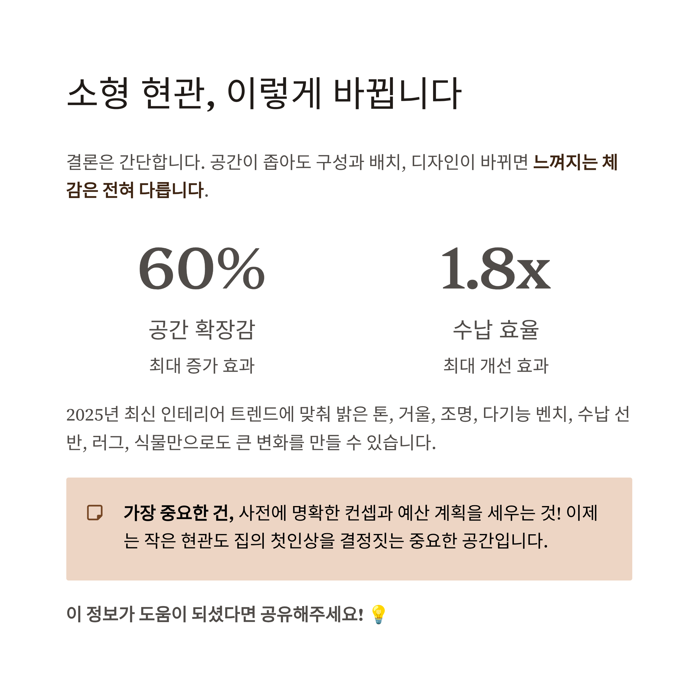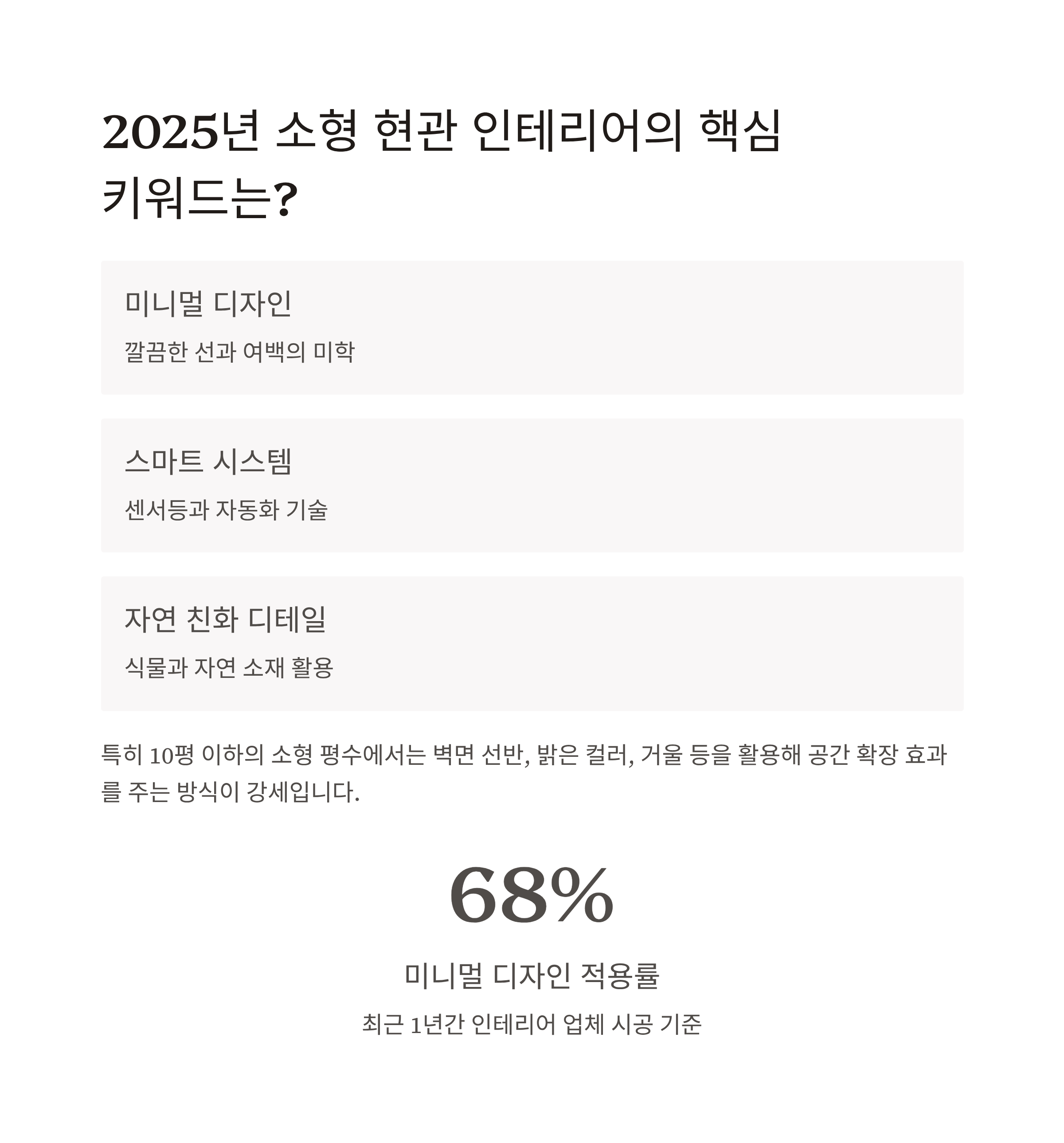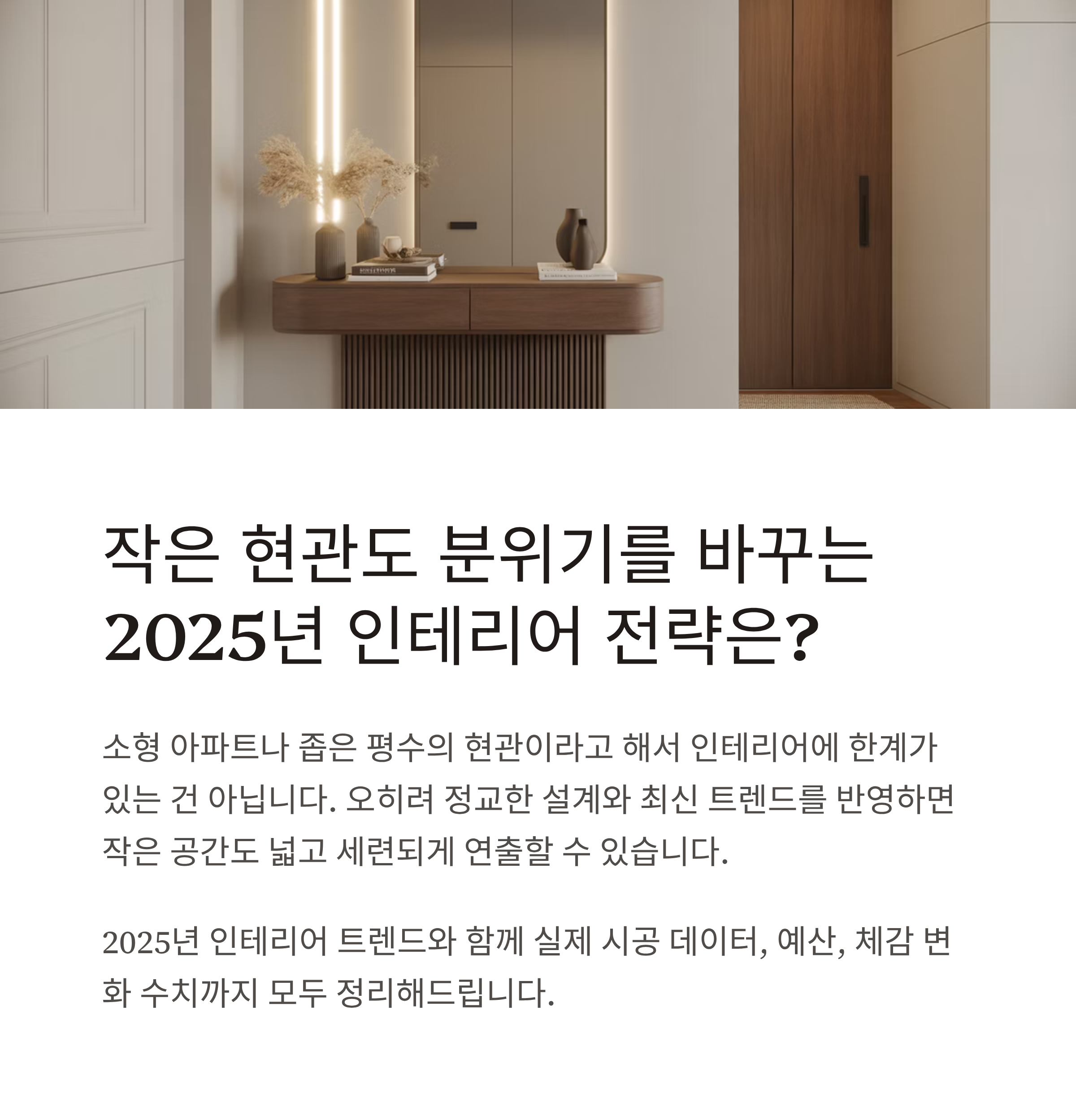 소형 아파트나 좁은 평수의 현관이라고 해서 인테리어에 한계가 있는 건 아닙니다. 오히려 정교한 설계와 최신 트렌드를 반영하면 작은 공간도 넓고 세련되게 연출할 수 있습니다. 2025년 인테리어 트렌드와 함께 실제 시공 데이터, 예산, 체감 변화 수치까지 모두 정리해드립니다.