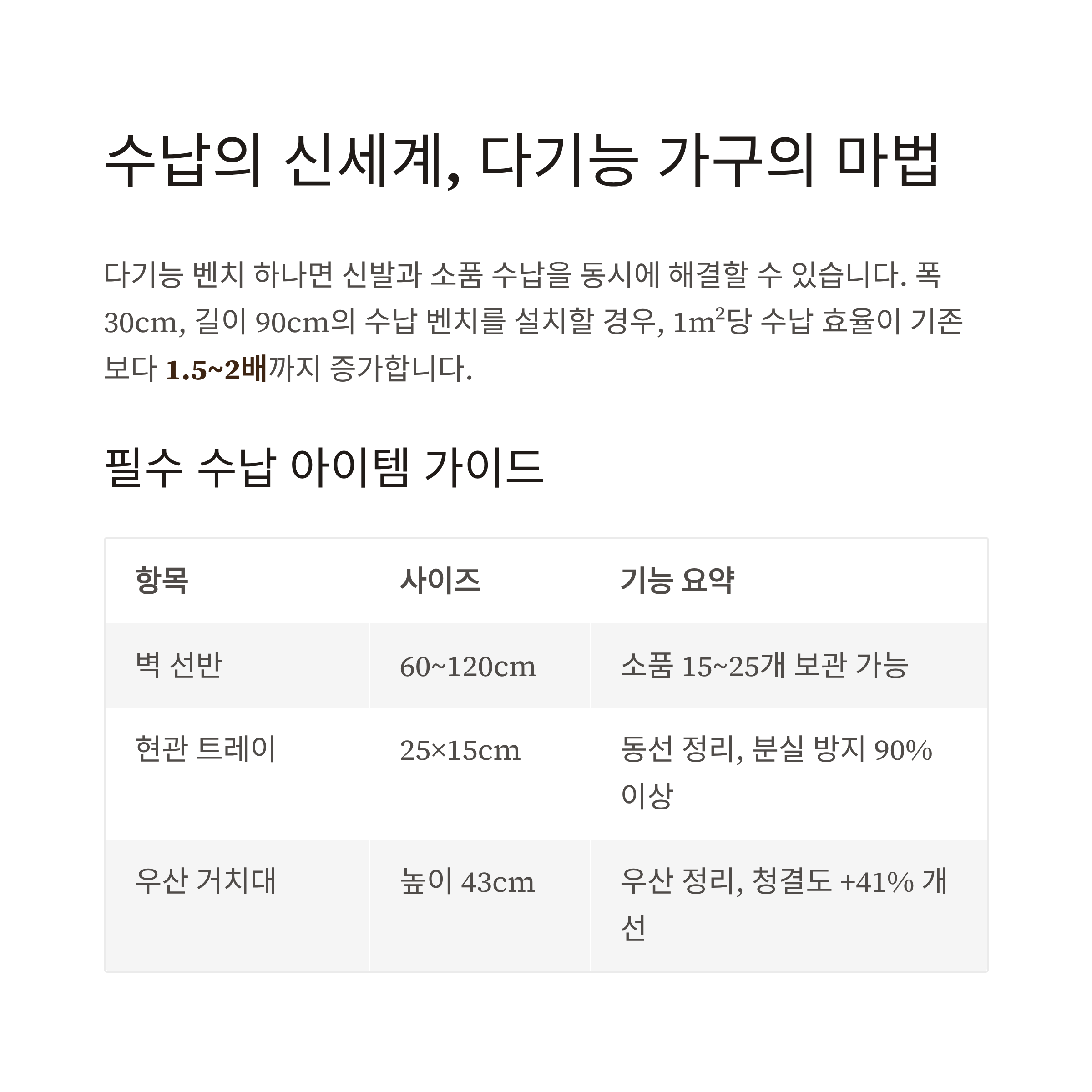 예를 들어 폭 30cm, 길이 90cm의 수납 벤치를 설치할 경우, 1m²당 수납 효율이 기존보다 1.5~2배까지 증가합니다.