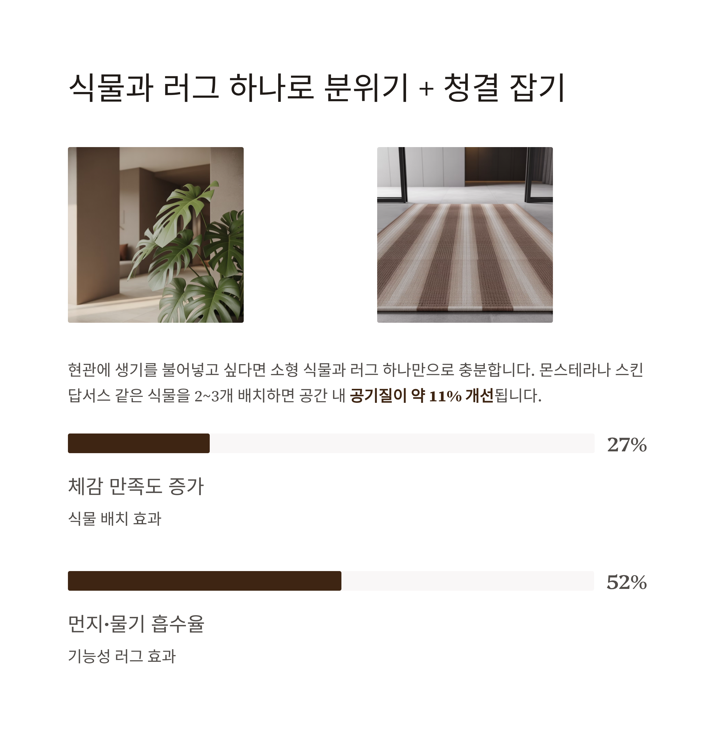 2025년 최신 인테리어 트렌드에 맞춰 밝은 톤, 거울, 조명, 다기능 벤치, 수납 선반, 러그, 식물만으로도 공간 확장감 최대 60%, 수납 효율 최대 1.8배, 분위기 전환 효과까지 누릴 수 있습니다.