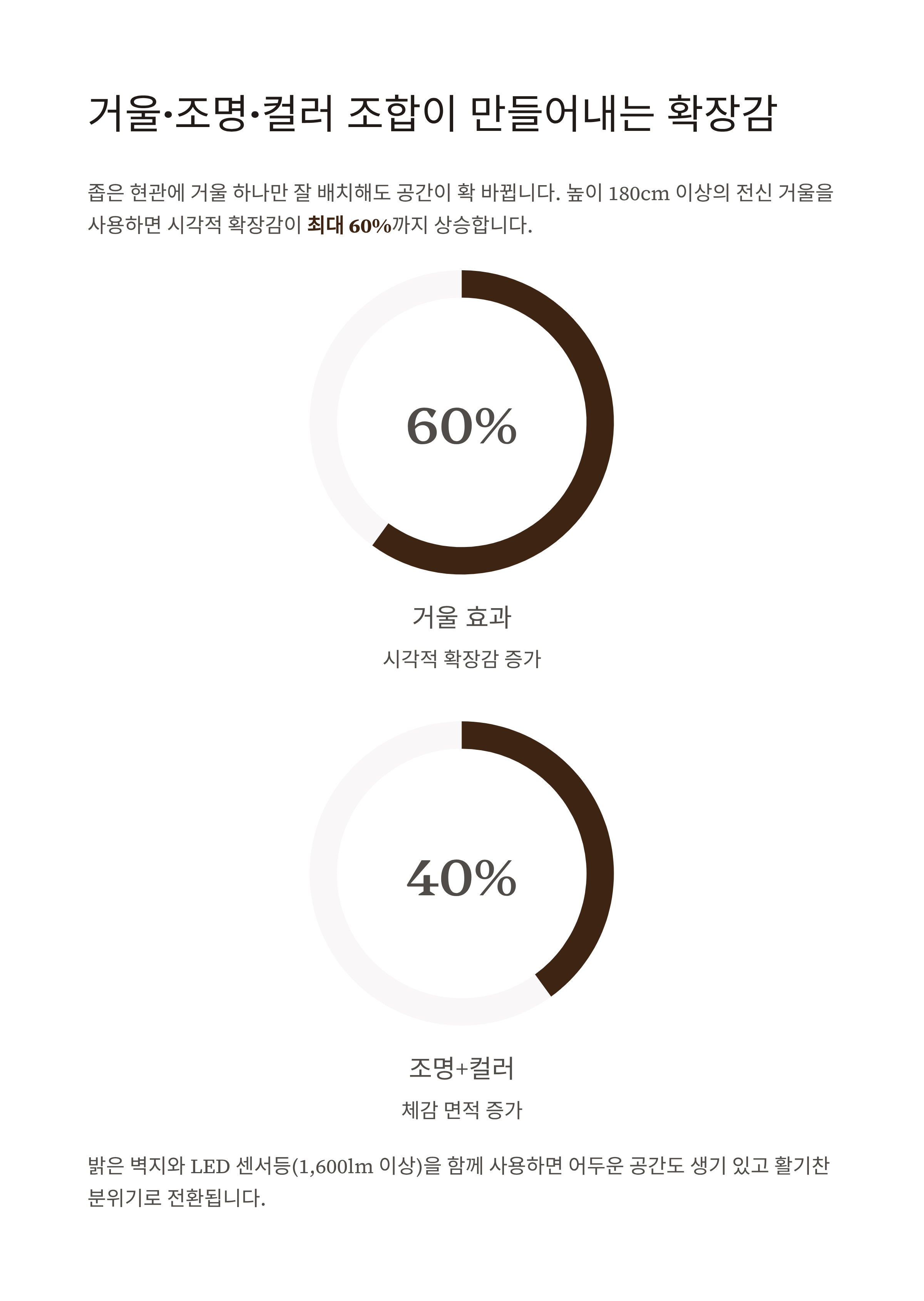 높이 180cm 이상의 전신 거울을 사용하면 시각적 확장감이 **최대 60%**까지 상승하며, 여기에 벽면 조명과 밝은 컬러를 더하면 체감 면적이 35~40%까지 넓어 보입니다.