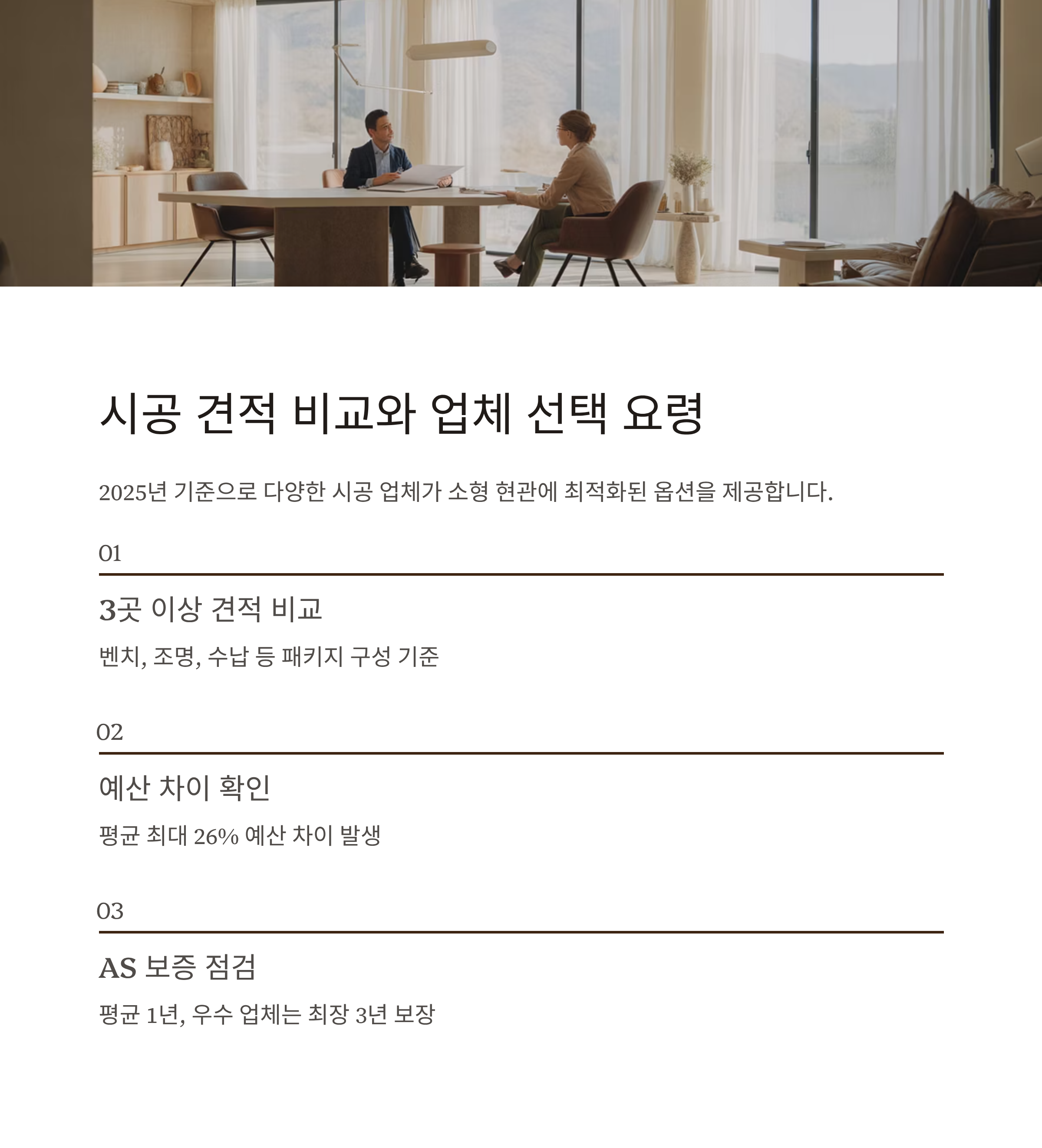 벤치, 조명, 수납 등 패키지 구성을 기준으로 3곳 이상 견적을 비교했을 때, 평균적으로 최대 26% 예산 차이가 발생합니다.