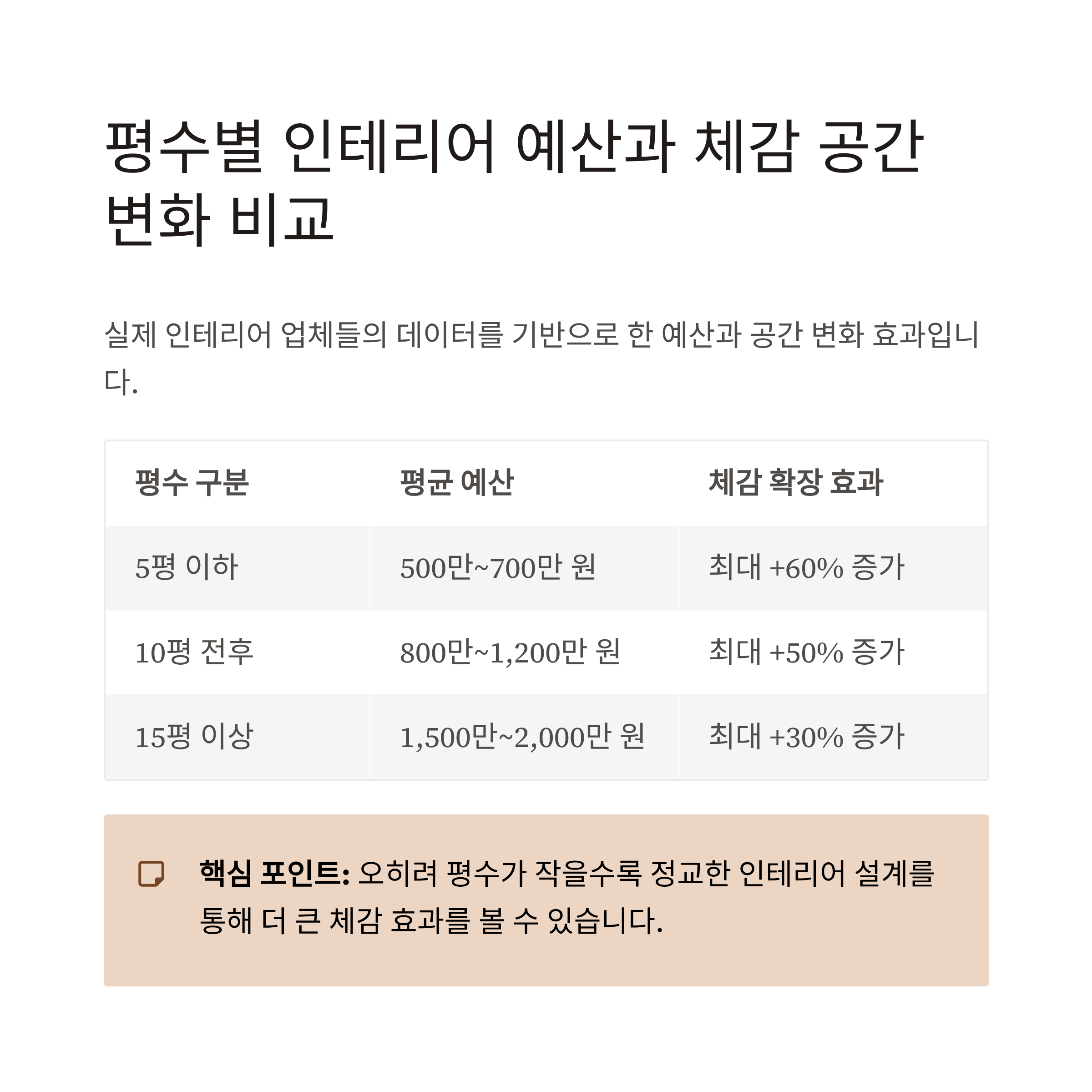 이 수치에서 알 수 있듯, 오히려 평수가 작을수록 정교한 인테리어 설계를 통해 더 큰 체감 효과를 볼 수 있습니다.