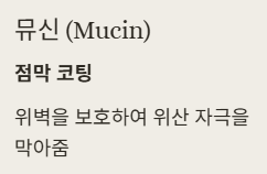 | 뮤신 (Mucin) | 점막 코팅 | 위벽을 보호하여 위산 자극을 막아줌 |