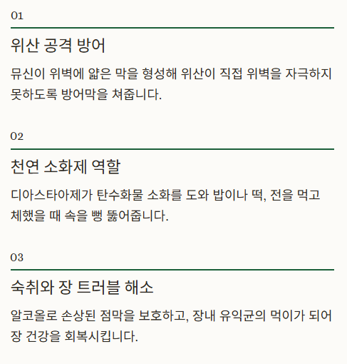 | 디아스타아제 | 소화 효소 | 음식물을 빠르게 분해해 더부룩함 완화 |
