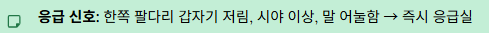응급 신호: 한쪽 팔·다리 갑자기 저림, 시야 이상, 말 어눌함이 함께 나타나면 즉시 응급실로 가야 합니다.