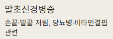| 말초신경병 | 손끝·발끝 저림, 감각 이상 | 당뇨병, 알코올성, 비타민결핍 |