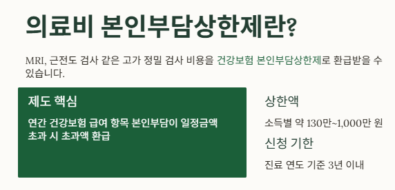 MRI, 신경검사, 입원 치료 등은 비용이 부담될 수 있습니다. 하지만 건강보험 가입자라면 본인부담상한제로 환급받을 수 있어요.