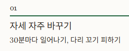 - 자세 자주 바꾸기: 30분마다 일어나기, 다리 꼬기 피하기