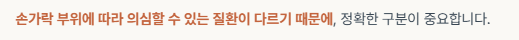 특히 손가락 부위에 따라 의심할 수 있는 질환이 다르기 때문에 정확한 구분이 중요합니다.