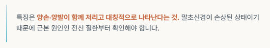특징은 양손·양발이 함께 저리고 대칭적으로 나타난다는 것.