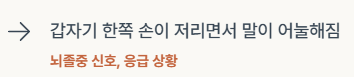 • 갑자기 한쪽 손이 저리면서 말이 어눌해짐 → 뇌졸중 신호, 응급