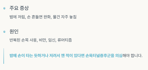 증상 밤에 저림, 손 흔들면 완화, 물건 자주 놓침