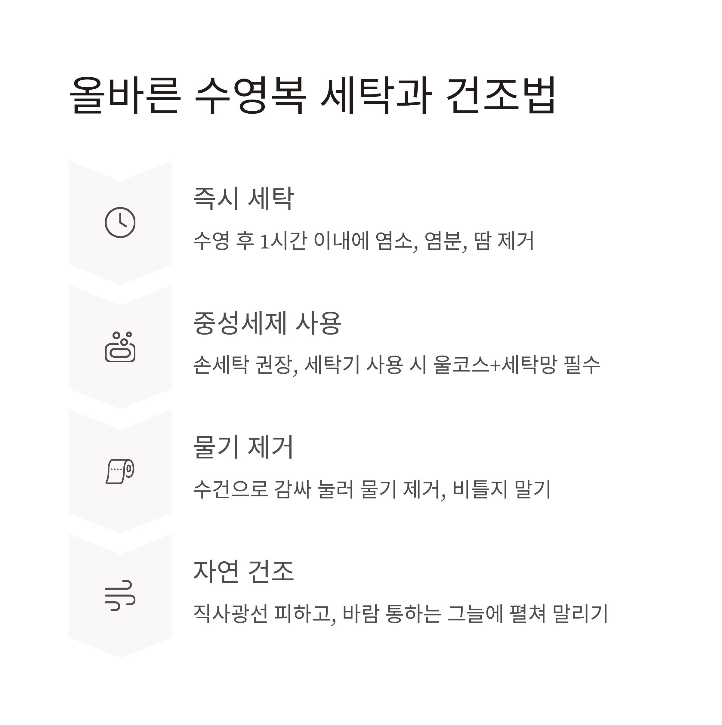 | 세탁 시간 | 수영 후 즉시 혹은 1시간 이내 헹굼 |