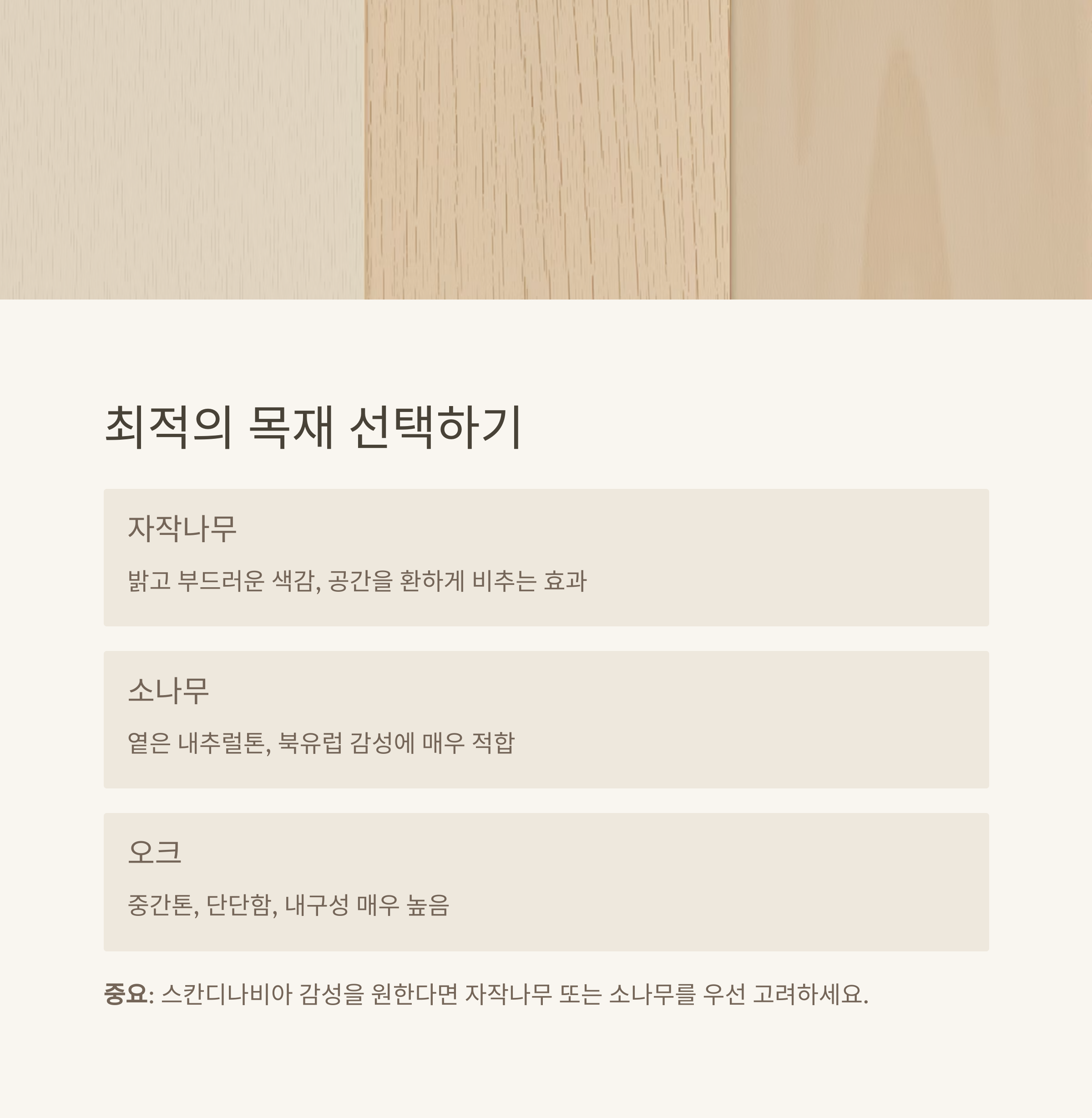 중요: 스칸디나비아 감성을 원한다면 자작나무 또는 소나무를 우선 고려하세요.