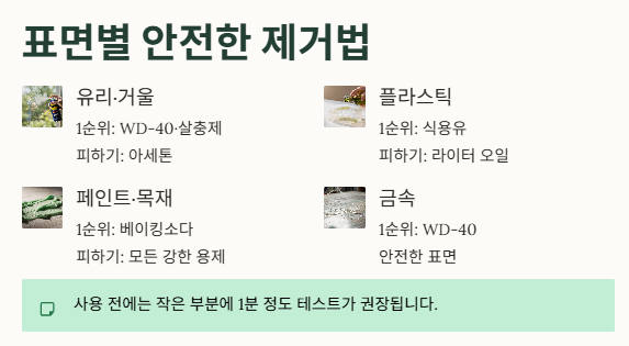 무조건 강한 용제를 쓰기보다는 단계적으로 시도하는 게 안전해요.