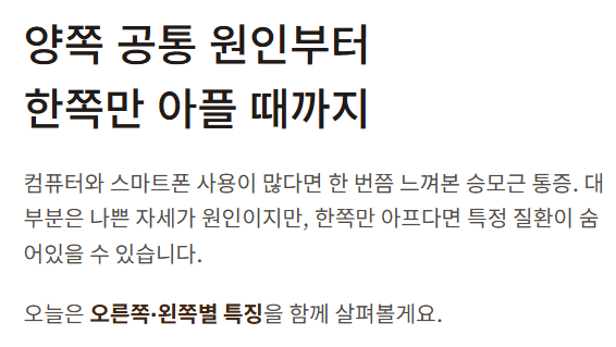 왼쪽은 비교적 덜 쓰는 쪽이지만, 특정 습관이나 자세에 따라 통증이 더 심할 수 있습니다.