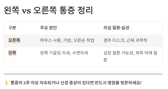 왼쪽은 비교적 덜 쓰는 쪽이지만, 특정 습관이나 자세에 따라 통증이 더 심할 수 있습니다.